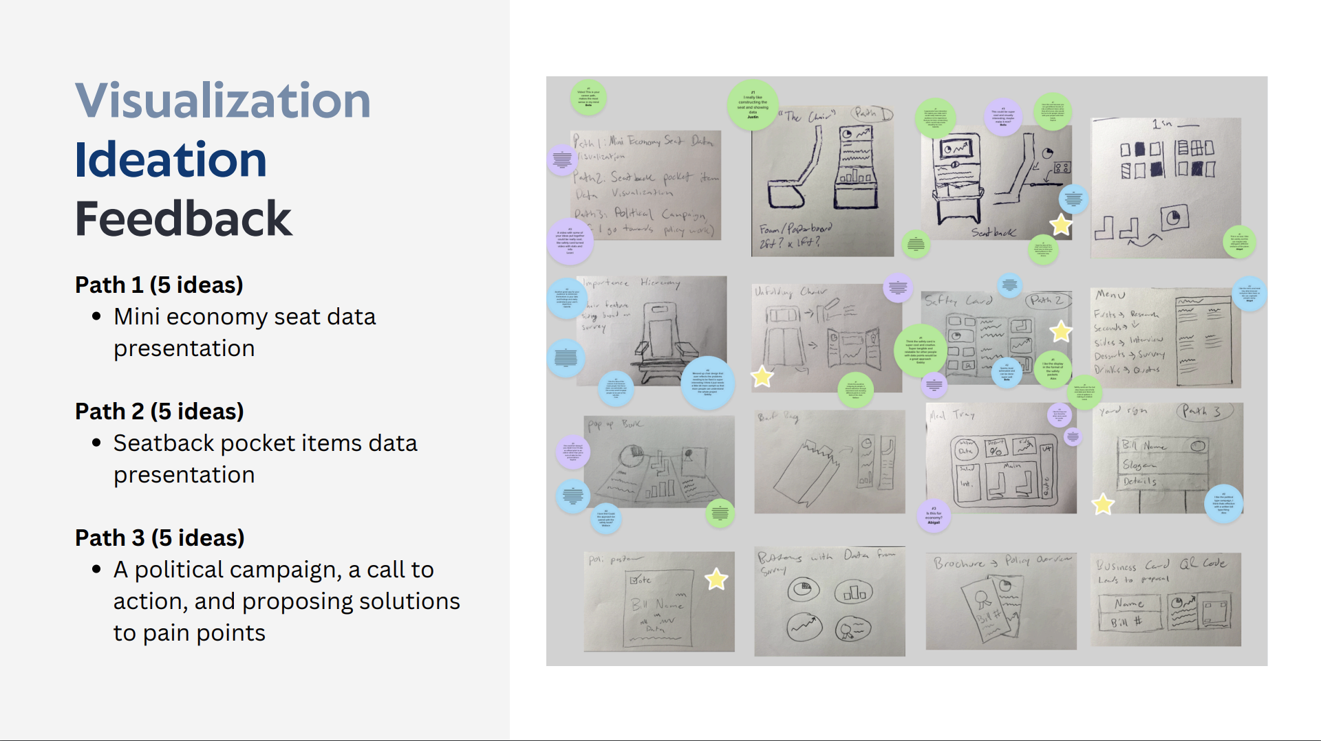 Inspired by in flight safety videos, the 3 one minute commercials highlight the most important findings of my survey and propose solutions. While not all of my solutions are meant to be implemented, the relatable nature of the commercial is intended to inspire viewers to text “comfort” to 888-8888 to support this call to action.